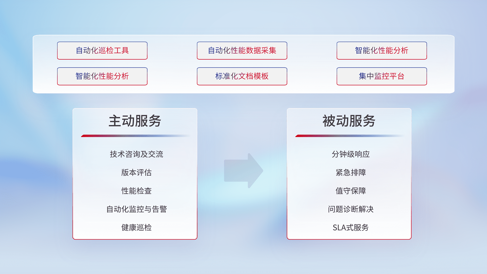 智能化工具和标准化文档,,保障服务质量,,,,提供主动服务(包含技术咨询、、版本评估、、、性能检查、、、、自动化监控与告警、、、健康巡检)和被动服务包含(分钟级响应、、、、紧急排障、、值守保障、、、、问题诊断解决、、、SLA服务)。。
